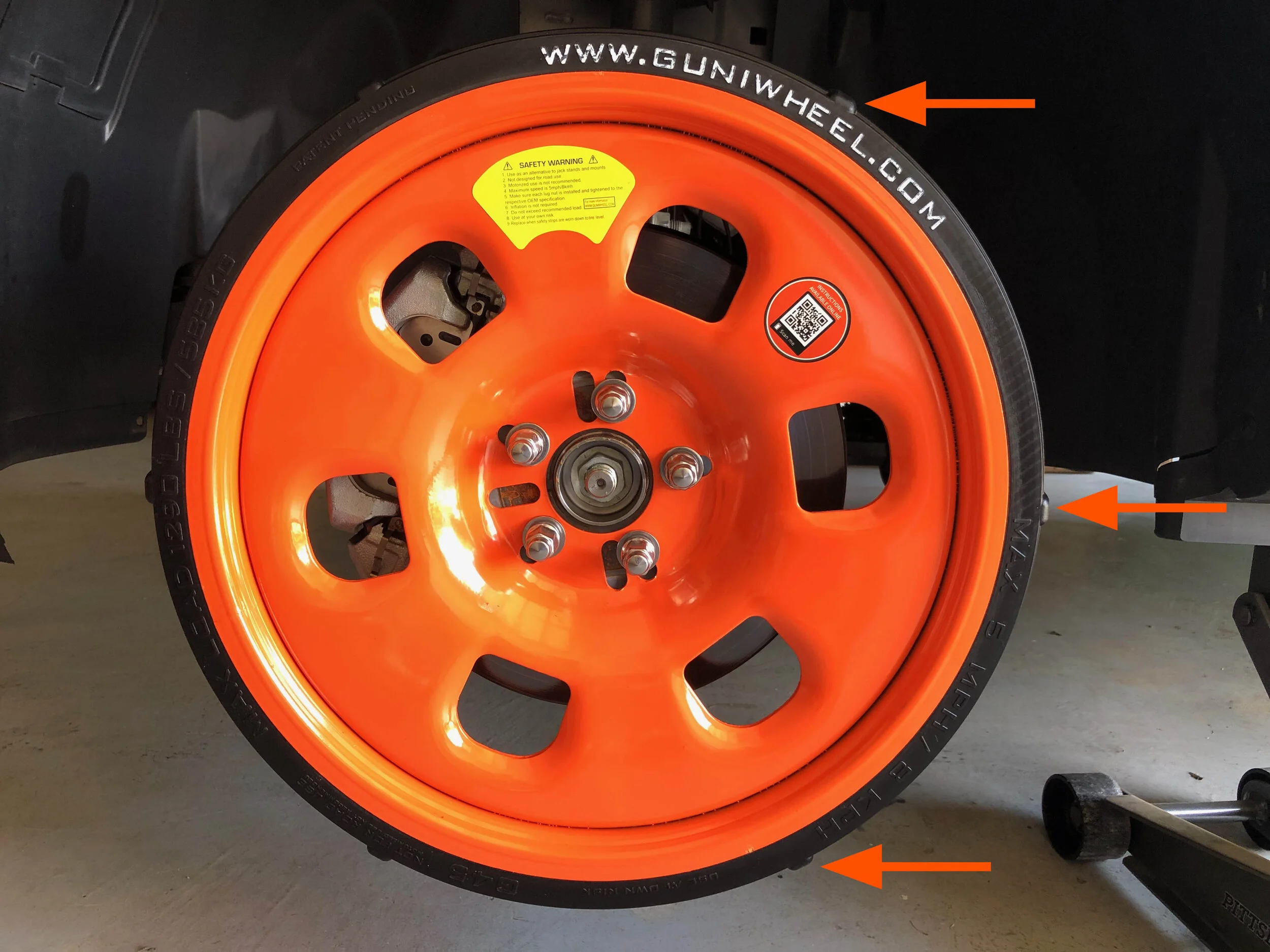 GUNIWHEEL™ is not a spare tire. It is not intended for road use. It may be used to move vehicles around a shop or lot at a max speed of 5mph/8kmh.